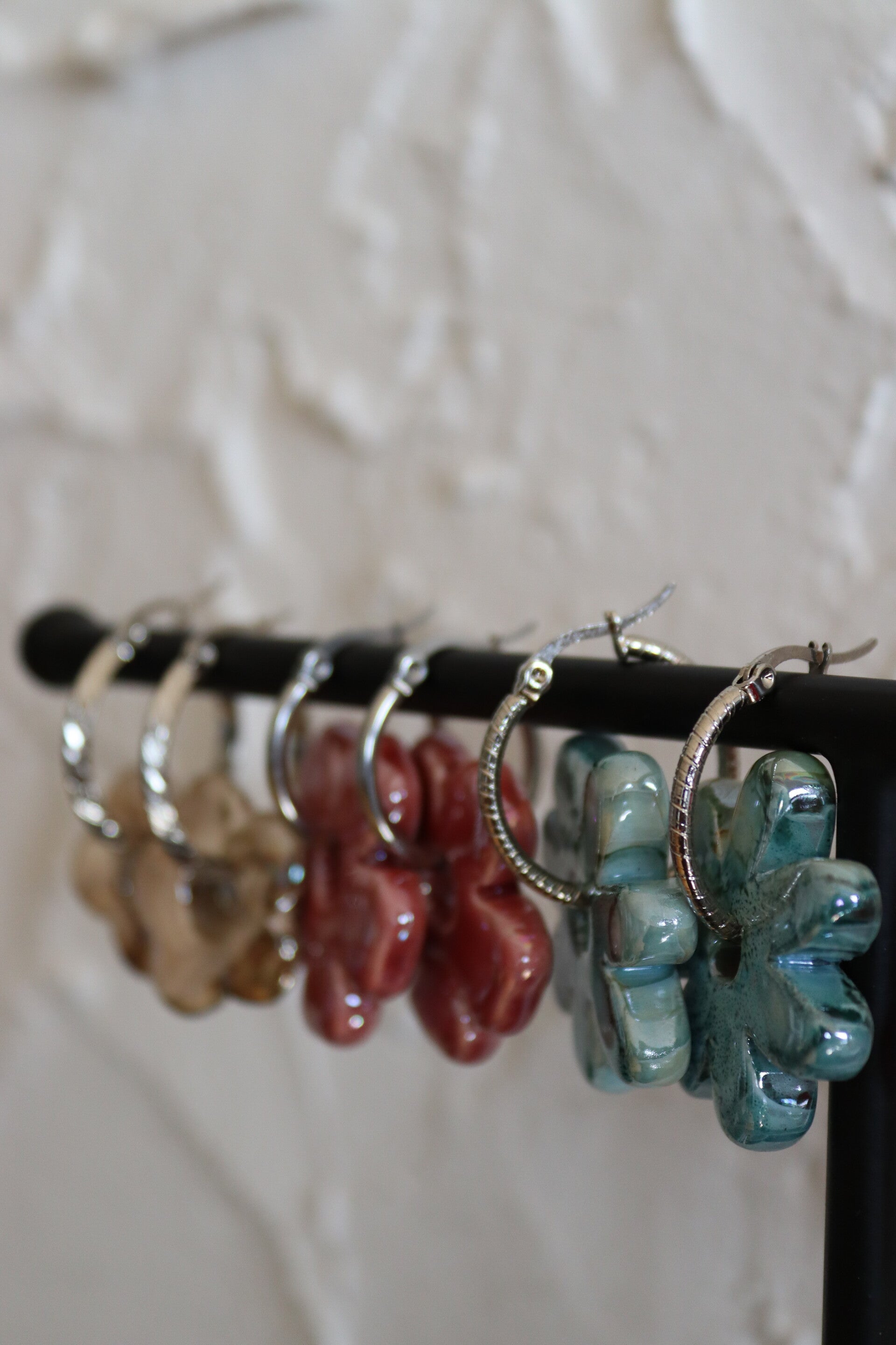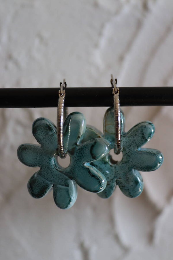 Deze collectie oorbellen is door mijzelf ontworpen, de bloemen zijn handgemaakt van keramiek in Italie en de oorbellen zijn van stainless steel je kan de bloemen ook eraf halen en de oorbellen alleen dragen.