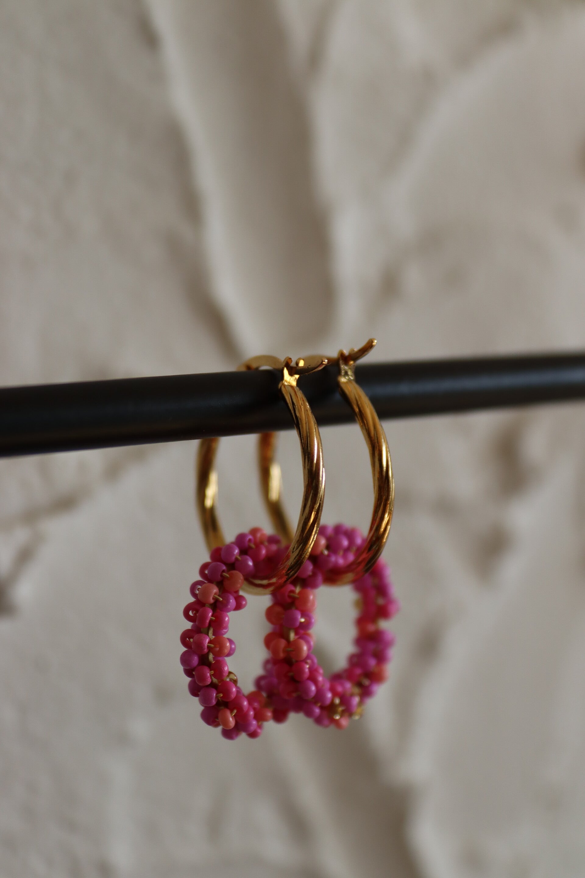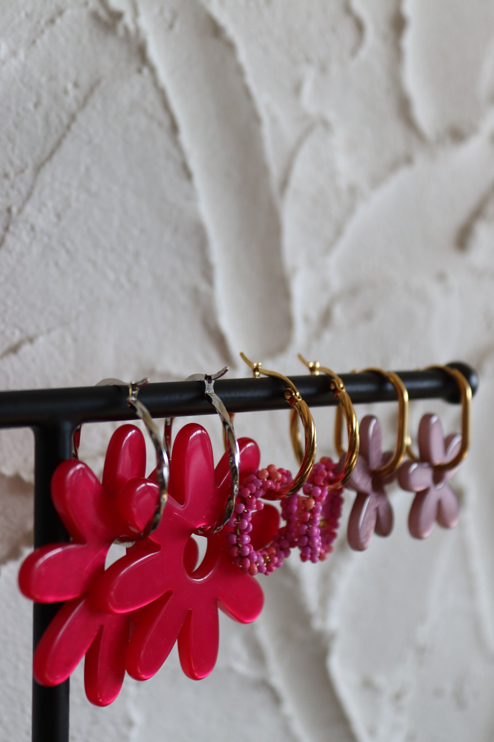 Deze collectie oorbellen is door mijzelf ontworpen, de hanger is van gemaakt van kralen en de oorbellen zijn van stainless steel je kan de bloemen ook eraf halen en de oorbellen alleen dragen.
