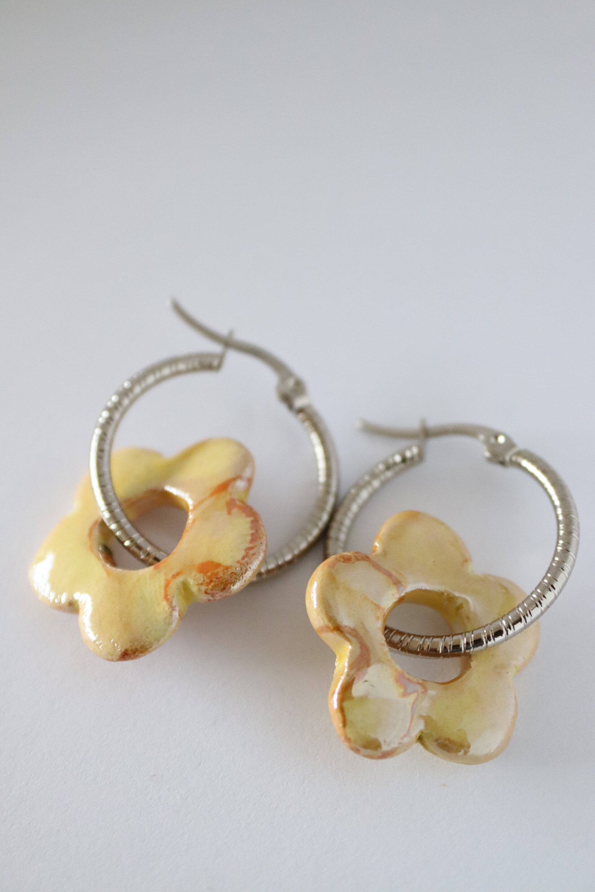Deze collectie oorbellen is door mijzelf ontworpen, de bloemen zijn gemaakt van keramiek in Italie en de oorbellen zijn van stainless steel je kan de bloemen ook eraf halen en de oorbellen alleen dragen.