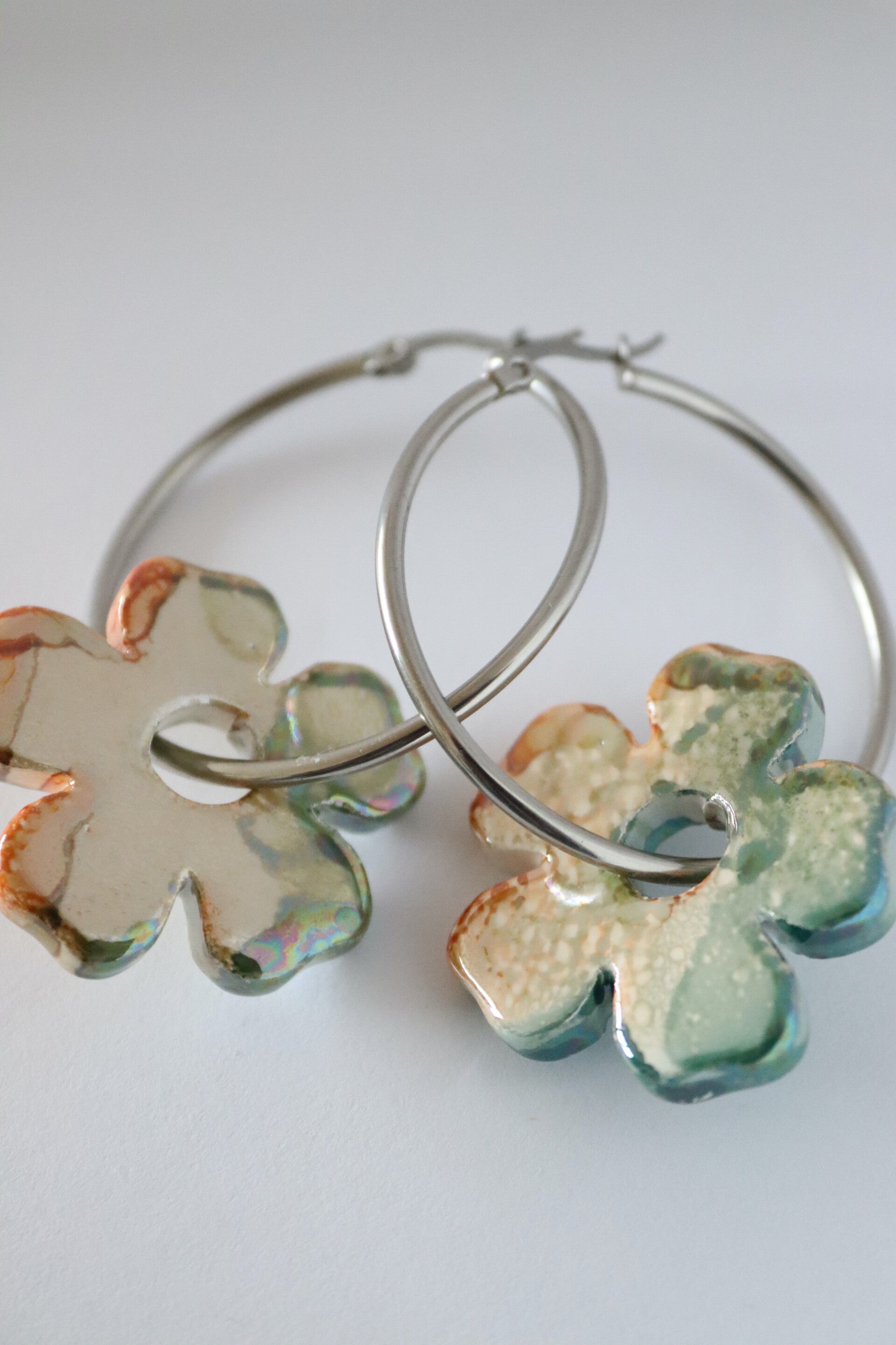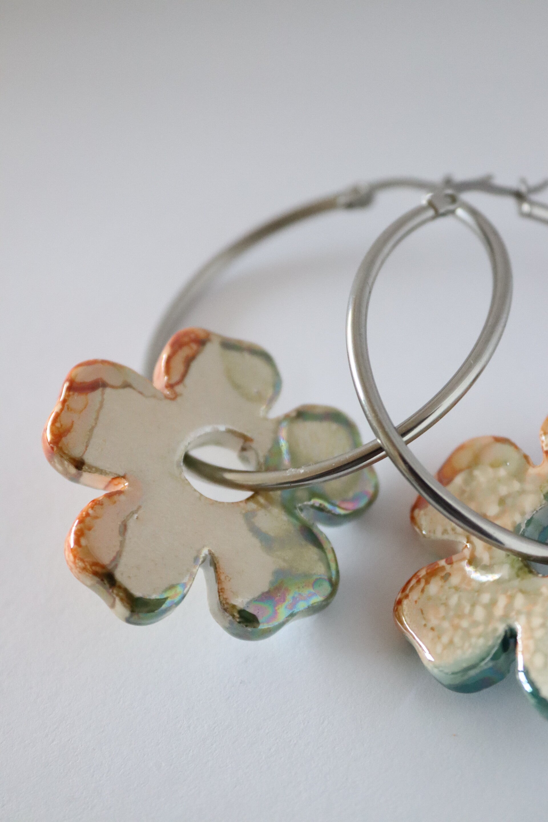 Deze collectie oorbellen is door mijzelf ontworpen, de bloemen zijn gemaakt van keramiek in Italie en de oorbellen zijn van stainless steel je kan de bloemen ook eraf halen en de oorbellen alleen dragen.